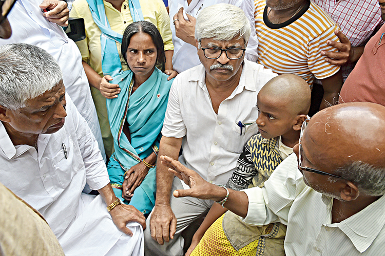 স্থানীয় বাসিন্দাদের সঙ্গে কথা সিপিএম নেতা সুজন চক্রবর্তী এবং কংগ্রেস নেতা আব্দুল মান্নানের। রয়েছেন রামবাবুর মা রেখা সাউ। ছবি: সুদীপ্ত ভৌমিক