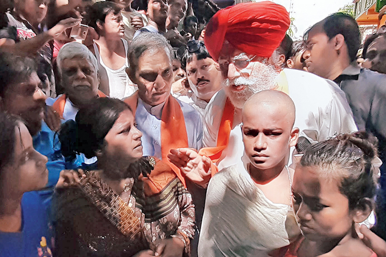 ধর্মবীর সাউয়ের স্ত্রী এবং ছেলের সঙ্গে সুরেন্দ্র সিংহ অহলুওয়ালিয়ার নেতৃত্বাধীন বিজেপির প্রতিনিধি দল। শনিবার কাঁকিনাড়ায়। ছবি: সুদীপ্ত ভৌমিক