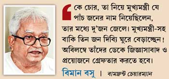 মুখ্যমন্ত্রী সম্প্রতি বলেছিলেন, সারদা-কাণ্ডে অপরাধ প্রমাণিত হলে তিনি ইস্তফা দেবেন। তাঁর দলের সাংসদ সৃঞ্জয় বসুকে সিবিআই গ্রেফতার করার পর থেকেই সিদ্ধার্থনাথ সিংহের মতো কেন্দ্রীয় বিজেপি নেতারা বলে আসছেন, পদত্যাগপত্র লিখতে শুরু করুন মুখ্যমন্ত্রী! কলকাতায় এসে বিজেপির সর্বভারতীয় সভাপতি অমিত শাহ বা লোকসভায় দাঁড়িয়ে কেন্দ্রীয় শাসক দলের তরুণ সাংসদ অনুরাগ ঠাকুর প্রশ্ন তুলেছেন, যে তৃণমূল কালো টাকা উদ্ধারের দাবিতে এত সরব, তারা সারদা কেলেঙ্কারিতে দোষীদের আড়াল করতে এত মরিয়া কেন? এই আবহেই মঙ্গলবার সুর আরও চড়িয়েছেন বাম নেতারা। ধর্মতলার ভিক্টোরিয়া হাউস থেকে কলেজ স্কোয়ার পর্যন্ত মিছিল করে সিপিএমের রাজ্য সম্পাদক বিমান বসু দাবি করেছেন, “কে চোর, তা নিয়ে মুখ্যমন্ত্রী যে পাঁচ জনের নাম নিয়েছিলেন, তার মধ্যে দু’জন জেলে। মুখ্যমন্ত্রী-সহ বাকি তিন জন দিব্যি ঘুরে বেড়াচ্ছেন! অবিলম্বে তাঁদের ডেকে জিজ্ঞাসাবাদ ও প্রয়োজনে গ্রেফতার করতে হবে।”