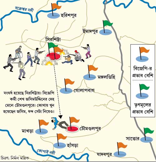 গত ২৭ অক্টোবর পাড়ুইয়েরই মাখড়া গ্রামে বহিরাগত সশস্ত্র দুষ্কৃতীদের নিয়ে হামলা চালানোর অভিযোগ উঠেছিল তৃণমূলের বিরুদ্ধে। এলাকার বিজেপি কর্মী-সমর্থকেরা তার প্রতিরোধ করেন। সংঘর্ষে মারা যান তিন জন। নিহতদের মধ্যে দু’জন তৃণমূলের এবং এক জন বিজেপির সমর্থক ছিলেন। ওই ঘটনার তিন সপ্তাহের মধ্যেই ফের খুনোখুনি। এ দিন নিহত জসিমউদ্দিন সম্পর্কে পাড়ুইয়ের বিজেপি নেতা সদাই শেখের (এক সময়ে বীরভূম জেলা তৃণমূল সভাপতি অনুব্রত মণ্ডলের ঘনিষ্ঠ ছিলেন) ভাইপো। এ দিন সিরশিট্টা গ্রামে সদাই ও জসিমউদ্দিনের নেতৃত্বেই হামলা হয়েছে বলে তৃণমূলের অভিযোগ। জসিমউদ্দিনের দেহ অবশ্য উদ্ধার হয়েছে চৌমণ্ডলপুরের ধান জমি থেকে।