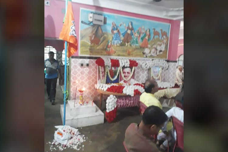 এ ভাবেই ঘরের ভিতর পতাকা তুলে বিজেপির উত্তর শহরতলি সাংগঠনিক জেলা কমিটির কার্যকারিণী বৈঠক হল। নিজস্ব চিত্র।