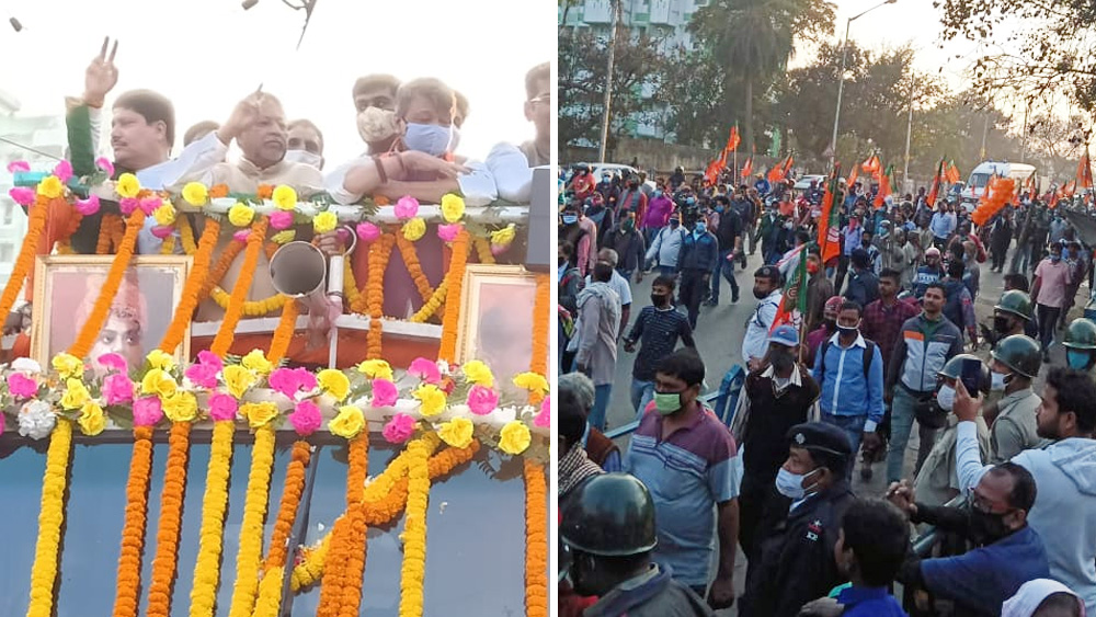 বিজেপি-তে যোগ দেওয়ার বছর দেড়েক পরে শোভন-বৈশাখী জুটিকে সোমবার আনুষ্ঠানিক ভাবে ময়দানে নামানোর উদ্যোগ মূলত নিয়েছিলেন বিজেপি-র কেন্দ্রীয় নেতৃত্বই। কথা ছিল, শোভন-বৈশাখীর সঙ্গে বাইক র্যালিতে থাকবেন কেন্দ্রীয় পর্যবেক্ষক কৈলাস বিজয়বর্গীয়। প্রস্তাবিত বাইক র্যালির মূল মুখ ছিলেন ওই তিন জনই। কিন্তু শেষবেলায় কার্যত একা হয়ে যান কৈলাস। কথা ছিল, কৈলাস সোজা আলিপুরে যাবেন মিছিলে যোগ দিতে। কিন্তু রুট বদলে তিনি চলে আসেন হেস্টিংসে মোড়ে রাজ্য বিজেপি-র নির্বাচনী কার্যালয়ে। সেখান থেকে সর্বভারতীয় সহ-সভাপতি মুকুল রায় এবং ব্যারাকপুরের সাংসদ অর্জুন সিংহকে সঙ্গী করে যান মিছিল শুরু করতে। কর্মসূচিতে নাম না থাকলেও ট্যাবলোয় কৈলাসের পাশে দাঁড়িয়ে কার্যত দলের মুখরক্ষা করেন মুকুল-অর্জুন।