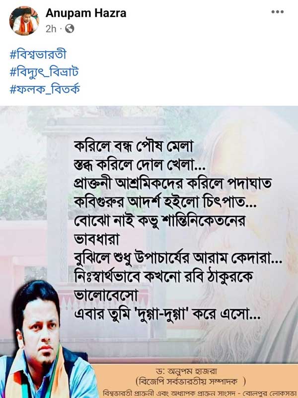 সোমবার ফেসবুকে একটি পোস্ট করেছেন অনুপম। তাতে কবিতার আকারে বিশ্বভারতীর উপাচার্যের সমালোচনা করা হয়েছে। বিদ্যুৎ বিশ্বভারতীতে পৌষমেলা বন্ধ করেছেন, দোল খেলা বন্ধ করেছেন, প্রাক্তনী আশ্রমিকদের ‘পদাঘাত’ করেছেন বলে অভিযোগ অনুপমের। তিনি জানিয়েছেন, শান্তিনিকেতনের ভাবধারা আসলে বিদ্যুৎ কখনও বোঝেননি। তাঁর আমলে বিশ্বভারতীতে কবিগুরুর আদর্শ ‘চিৎপাত’ হয়েছে। বিদ্যুৎ কেবল ‘উপাচার্যের আরামকেদারা’কেই প্রাধান্য দিয়েছেন বলে দাবি অনুপমের। সব শেষে উপাচার্যের উদ্দেশে বিজেপি নেতার পরামর্শ, ‘‘নিঃস্বার্থ ভাবে কখনও রবি ঠাকুরকে ভালবেসো। এ বার তুমি দুগ্গা দুগ্গা করে এসো।’’ অর্থাৎ, উপাচার্যকে শান্তিনিকেতন ছাড়ার পরামর্শ দিয়েছেন অনুপম। উল্লেখ্য, তিনি নিজেও বিশ্বভারতী বিশ্ববিদ্যালয়ের প্রাক্তনী। সেখানে অধ্যাপনাও করেছেন। তবে নিজের পোস্টে কোথাও অনুপম বিদ্যুতের নামটি উল্লেখ করেননি।