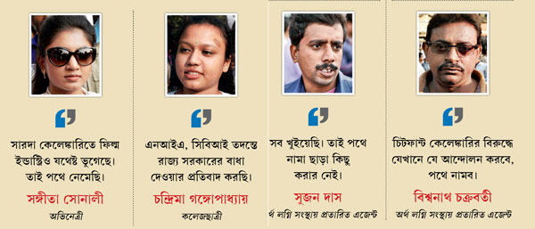 তবু শাসক দলের নানা অপকীর্তির প্রতিবাদে এ দিনের মিছিলে যাঁরা এসেছিলেন, তাঁদের মধ্যে চিত্রপরিচালক কৌশিক চক্রবর্তী বলেন, “কাজ না-পাওয়ার ভয়ে কত দিন গুটিয়ে বসে থাকব! স্রেফ তৃণমূলের বিরোধিতাই নয়, অন্যায়ের প্রতিবাদ করতে পথে নেমেছি।” শ্রীকান্ত মোহতাদের প্রযোজিত কয়েকটি হিট ছবির পরিচালক কৌশিক। জনৈক অভিনেত্রী সঙ্গীতা সোনালী বলেন, “সারদা-কেলেঙ্কারির জেরে ফিল্ম ইন্ডাস্ট্রিও ভুক্তভোগী। তা রাজ্য বিজেপির কয়েকটি সেলের সদস্যরা, বিজেপির সহমর্মী কয়েকটি সংগঠনের কিছু লোকজনও মিছিলে হাঁটেন। কলকাতায় দু’-দু’টি রাজনৈতিক দলের ডাকে বিশিষ্টজনদের পরপর দু’টি মিছিল দেখে কৌতুকের সুর কংগ্রেসের পোড়খাওয়া নেতা মানস ভুঁইয়ার গলায়। বললেন, “রাজনৈতিক ছাতার নীচে ‘বুদ্ধিজীবীদের’ মিছিল সত্যিকারের বুদ্ধিজীবীদের সঙ্কটে ফেলে দিচ্ছে।”