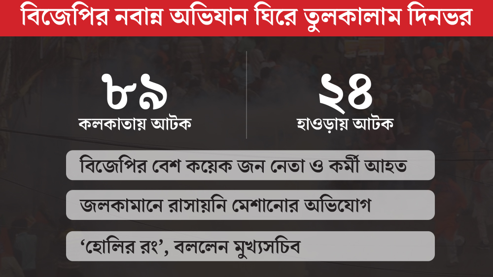 যদিও রাজ্যের মুখ্যসচিব আলাপন বন্দ্যোপাধ্যায় জানিয়েছেন, জলে ‘হোলির রং’ ছিল। তার কারণও তিনি ব্যাখ্যা করেছেন। আলাপনের কথায়, ‘‘জলে হোলির রং মেশানো ছিল। বিশ্ব জুড়েই এমনটা করা হয়। বিক্ষোভকারীরা ভিড়ে মিশে গেলেও, পরে তদন্তের প্রয়োজনে জামার রং দেখে তাঁদের শনাক্ত করা যায়।’’ বিজেপি কর্মীদের ছোড়া ইটের আঘাতে বহু পুলিশকর্মী আহত হয়েছেন বলে পাল্টা দাবি করেছেন আলাপন বন্দ্যোপাধ্যায়। তিনি জানান, কলকাতা পুলিশ ৮৯ জন এবং হাওড়া পুলিশ ২৪ জন বিক্ষোভকারীকে আটক করেছে। বিজেপির মিছিল থেকে একটি আগ্নেয়াস্ত্র উদ্ধার হয়েছে বলে জানান মুখ্যসচিব। যদিও রাজ্য বিজেপির সভাপতি দিলীপ ঘোষ বলেন, ‘‘ওই ব্যক্তি বিজেপির এক নেতার দেহরক্ষী। তাঁর কাছে ওই পিস্তলের লাইসেন্স রয়েছে। মিথ্যে অভিযোগে ওঁকে ফাঁসানো হচ্ছে।’’ পুলিশ সূত্রে খবর, জম্মু কাশ্মীরের রাজৌরি থেকে ওই পিস্তলের লাইসেন্স নেওয়া হয়। গোটা ঘটনায় অজ্ঞাতপরিচয় বিজেপি কর্মীদের বিরুদ্ধে মামলা দায়ের করেছে লালবাজার।