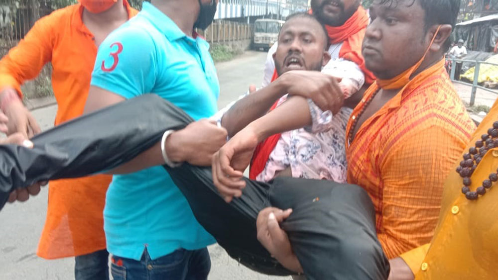 আহত বিজেপি কর্মীকে সরিয়া নিয়ে যাওয়া হচ্ছে। —নিজস্ব চিত্র।