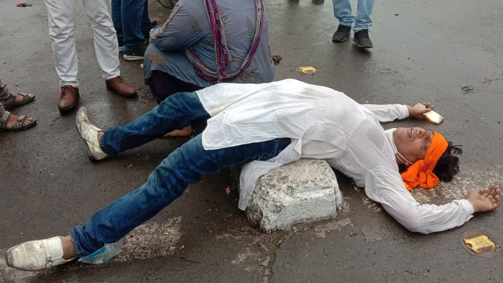 আহত বিজেপি কর্মী পড়ে রয়েছেন রাস্তায়। —নিজস্ব চিত্র।