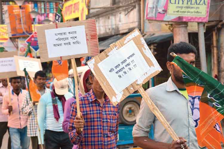 বোলপুরে বিজেপির প্রতিবাদ মিছিল। ছবি: বিশ্বজিৎ রায়চৌধুরী।