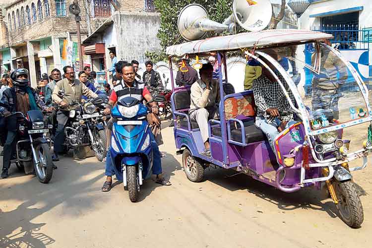 জনজীবন স্বাভাবিক রাখার আর্জি জানিয়ে লাভপুরে প্রচার। ছবি: কল্যাণ আচার্য
