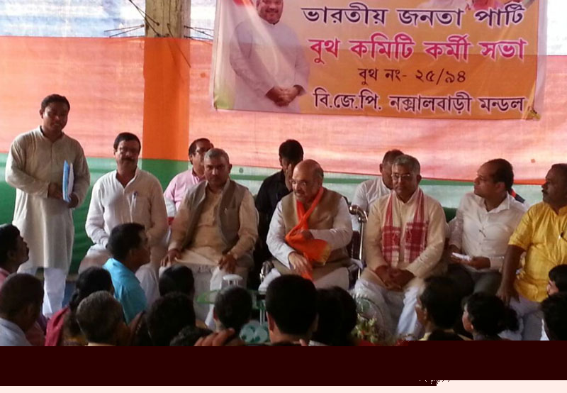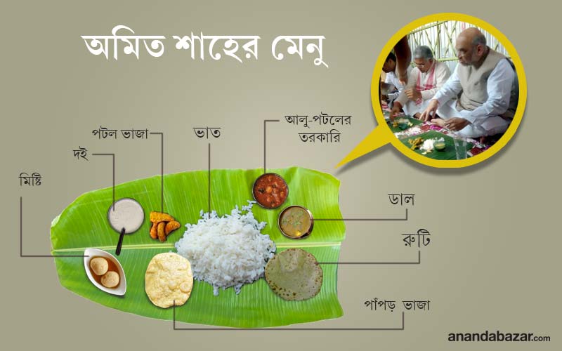 বিজেপি সভাপতি অমিত শাহকে স্বাগত জানাতে এ দিন বাগডোগরা বিমানবন্দরে হাজির ছিলেন বিজেপি-র রাজ্য সভাপতি দিলীপ ঘোষ এবং কেন্দ্রীয় পর্যবেক্ষক কৈলাস বিজয়বর্গীয়। বাগডোগরা থেকে অমিত শাহ সরাসরি চলে যান নকশালবাড়ি। বিজেপি-র ‘বুথ চলো’ কর্মসূচির সূচনা করতেই অমিত শাহের এই নকশালবাড়ি যাত্রা। বাংলার এমন কোনও জায়গা থেকে ‘বুথ চলো’ কর্মসূচি শুরু করতে চাইছিলেন অমিত শাহ, যে অঞ্চল রাজনৈতিক কারণে গোটা ভারতে বিখ্যাত। সে কারণেই অতিবামপন্থী আন্দোলনের জন্মভূমি নকশালবাড়িকে বেছে নেয় বিজেপি। স্থানীয় সাংসদ তথা কেন্দ্রীয় মন্ত্রী সুরেন্দ্র সিংহ অহলুওয়ালিয়াও এই কর্মসূচিতে হাজির ছিলেন। বিজয়বর্গীয়, অহলুওয়ালিয়া, দিলীপ ঘোষ, রাহুল সিংহদের নিয়ে অমিত শাহ প্রথমে নকশালবাড়ির দীর্ঘ দিনের বিজেপি কর্মী রাজু মাহালি-গীতা মাহালির বাড়ি যান। সেখানেই মধ্যাহ্নভোজ সারেন বিজেপি নেতারা। টিনের বাড়ির দাওয়ায় বসে কলাপাতায় ভোজ। মেনু— ভাত, রুটি, ডাল, পটল ভাজা, আলু-পটলের তরকারি, পাঁপড় ভাজা, দই, মিষ্টি।