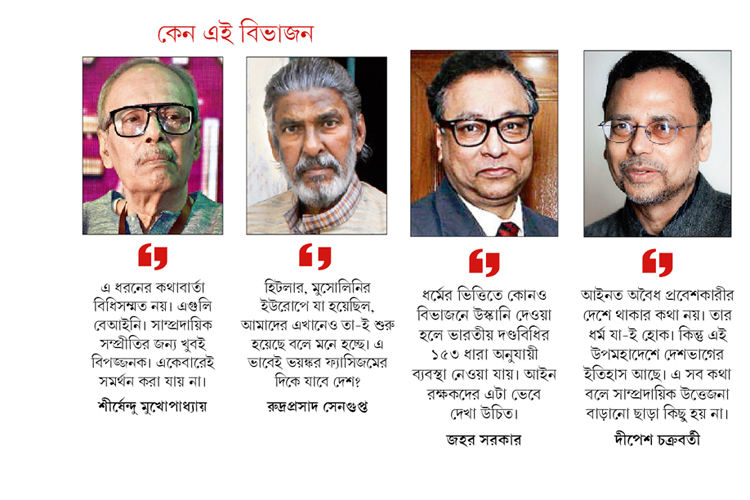 বাম পরিষদীয় নেতা সুজন চক্রবর্তী বলেন, ‘‘দিলীপ ঘোষেরা প্রমাণ করে দিচ্ছেন, তাঁরা বাংলা এবং বাঙালির বিরোধী। ধর্মের ভিত্তিতে নাগরিকত্ব এ দেশের সংবিধান মেনে নেয় না। তেমন কোনও চেষ্টা হলে মানুষই রুখবেন।’’ বিরোধী দলনেতা আব্দুল মান্নান বলেন, ‘‘সঙ্ঘ পরিবারই মানুষকে ধর্ম, জাতপাতের ভিত্তিতে ভাগ করতে চায়। এই বিভাজনের চক্রান্ত কখনও সফল হবে না।’’