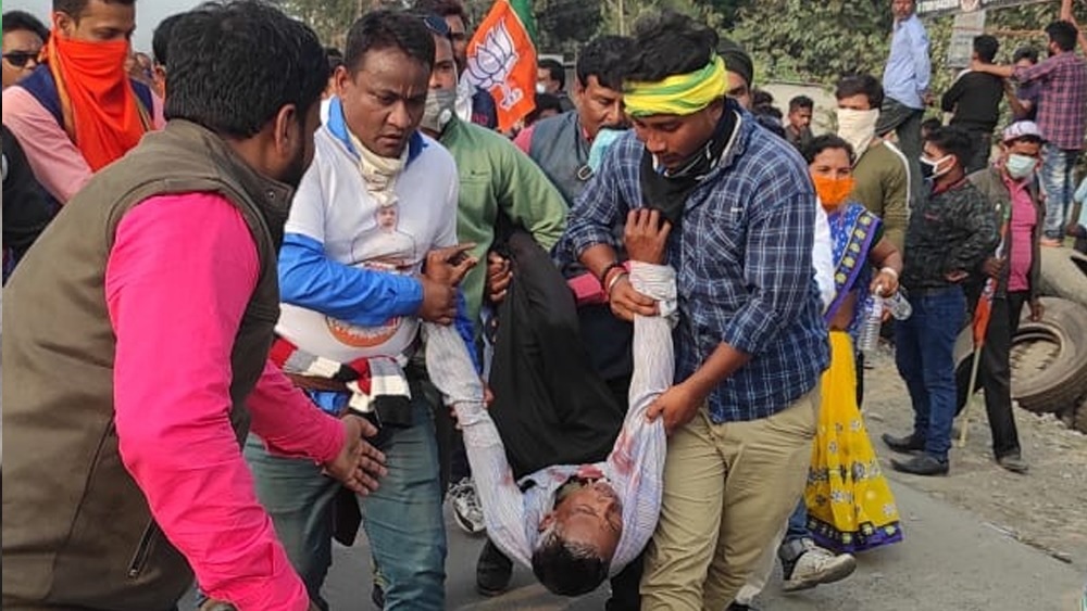 আহত এক বিজেপি কর্মীরা নিয়ে যাওয়া হচ্ছে। —নিজস্ব চিত্র