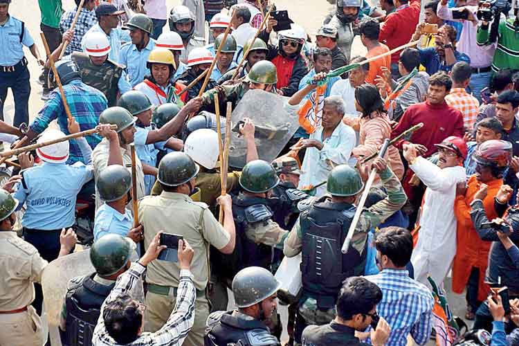 ঝান্ডা উঁচিয়ে: পুলিশকে মারতে উদ্যত বিজেপির এক কর্মী। রবিবার বালুরঘাটে। ছবি: অমিত মোহান্ত