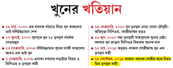 সোমবার বোলপুর-পালিতপুর সড়কে মুলুক গ্রামের কাছে নানুরের বিধায়ক গদাধর হাজরার অনুগামী তিন তৃণমূল কর্মী খুন হওয়ার ঘটনা ফের বেআব্রু করে দিয়েছে এই গোষ্ঠীদ্বন্দ্বকেই। নিহত কুরবান শেখের পরিবার কাজল শেখ ও তাঁর অনুগামীদের বিরুদ্ধে খুনের অভিযোগ এনেছে। কুরবান ছিলেন কাজল-বিরোধী গদাধরের ঘনিষ্ঠ। নাম করতে না-চাওয়া এলাকার অনেকেই বলছেন, রাজায় রাজায় যুদ্ধে এ ভাবেই উলুখাগড়ার প্রাণ যায়!
