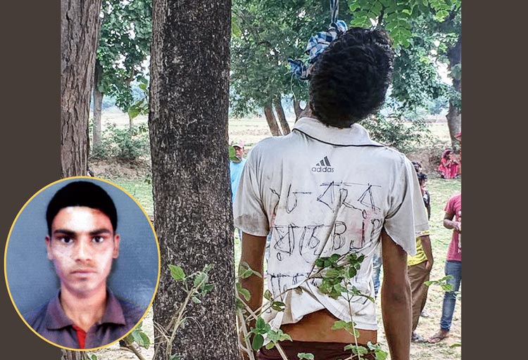 নিহত বিজেপি কর্মী ত্রিলোচন মাহাতোর (ইনসেটে) ঝুলন্ত দেহ। বলরামপুরের খুঁদিগোড়ায়। —ফাইল চিত্র।
