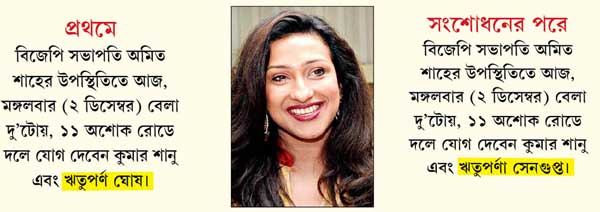 এসএমএসটি ছড়িয়ে পড়তেই গুঞ্জন শুরু হয়। বিজেপির মিডিয়া সেল-এ পরপর ফোন আসতে থাকে প্রয়াত চিত্রপরিচালকের নাম কী ভাবে উঠে এল? মিডিয়া সেল নড়েচড়ে বসে। একটু পরে সেল-এর তরফে জানানো হয়, ‘বিজেপি সাধারণ সম্পাদক সরোজ পাণ্ডের সঙ্গে কথা বলে জানা গিয়েছে, নামটা লিখতে ভুল হয়েছে। সঠিক নামটি হবে ঋতুপর্ণা সেনগুপ্ত।’ মিডিয়া সেল-এর সূত্রটি জানান, “সরোজজি জানিয়েছেন, ওঁর সঙ্গে ঋতুপর্ণার কথা হয়ে রয়েছে। ঋতুপর্ণা কিছু ক্ষণের মধ্যেই আসছেন।” একটু পরেই সাংবাদিকদের কাছে সংশোধিত এসএমএস-ও এসে পৌঁছয়, তাতে কুমার শানু ও ঋতুপর্ণার নাম লেখা। সুযোগ পেয়ে এই নামবিভ্রাট নিয়ে বিজেপি-কে কটাক্ষ করে তৃণমূল। তৃণমূল সাংসদ ডেরেক ও’ব্রায়েন বলেন, “ঋতুপর্ণ যে জীবিত নেই, সেটুকু জ্ঞানও বিজেপির নেই। এই বিজেপি বাংলাকে চেনে না। বাঙালির সংস্কৃতিও জানে না।”