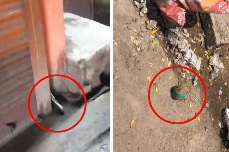বন্ধ দোকানের সামনে থেকে উদ্ধার গুলি ভরা পিস্তল, যত্রতত্র পড়ে রয়েছে এ রকম না ফাটা বোমা। —নিজস্ব চিত্র।