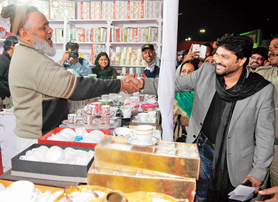 পাকিস্তানের এক বিক্রেতার সঙ্গে বাবুল সুপ্রিয়। মঙ্গলবার কলকাতায় শিল্প-বাণিজ্য মেলায়। —নিজস্ব চিত্র