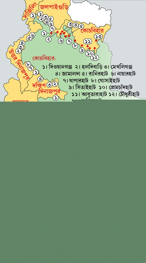 বিষয়টি নবান্ন অবধি গড়ানোর পরে নড়েচড়ে বসেছে প্রশাসন। সম্প্রতি ওই ৪১টি হাটের অবস্থান জানিয়ে পঞ্চায়েত দফতরকে রিপোর্ট দিতে বলেছে নবান্ন। সেই নির্দেশ পেয়ে দফতর আবার রিপোর্ট চেয়েছে সংশ্লিষ্ট সীমান্ত এলাকার বিডিওদের কাছে। তাতে দেখা যাচ্ছে, ৪১টির মধ্যে ১৩টি হাট রয়েছে কোচবিহারে, সাতটি জলপাইগুড়িতে, উত্তর ও দক্ষিণ দিনাজপুরে ছ’টি করে, চারটি মুর্শিদাবাদে এবং দু’টি উত্তর ২৪ পরগনায়। এ ছাড়া, নদিয়া, মালদহ ও দার্জিলিঙে রয়েছে একটি করে হাট। বেশ কয়েকটি হাট আবার ব্যক্তি মালিকানাধীন। গোয়ালপোখরের দেবীগঞ্জে একটি বিরাট হাট চালাচ্ছে স্থানীয় মাদ্রাসা। পঞ্চায়েত দফতরের মাধ্যমে এই রিপোর্ট হাতে পেয়ে নবান্নের কর্তাদের চোখ কপালে ওঠার জোগাড়! প্রশাসনের বক্তব্য, আগে সব ক’টি হাটেরই লাইসেন্স ছিল। সেই রিপোর্টই ছিল বিএসএফের কাছে। কিন্তু ১৮টি হাট লাইসেন্স পুনর্নবীকরণ করেনি। ফলে এখন সেগুলি বেআইনি।