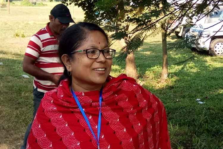 গণনাকেন্দ্রের বাইরে কালিয়াগঞ্জের বাম-কংগ্রেস জোট সমর্থিত কংগ্রেস প্রার্থী ধীতশ্রী রায়। —নিজস্ব চিত্র
