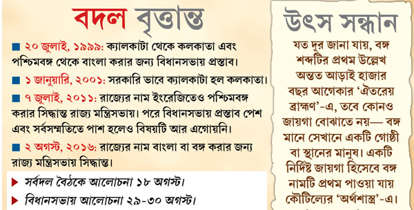 এ দিন মন্ত্রিসভার বৈঠকের পরে পরিষদীয়মন্ত্রী পার্থ চট্টোপাধ্যায় জানান, ১৮ অগস্ট স্পিকারের ডাকে বিধানসভায় সর্বদল বৈঠক বসবে। ২৬ অগস্ট থেকে বিধানসভার বিশেষ অধিবেশন ডেকে প্রস্তাবটি আলোচনা হবে। পার্থবাবুর কথায়, ‘‘আগের বার উদ্যোগী হওয়ার পরে পাঁচ বছর হয়ে গিয়েছে। এখন তাই নতুন করে করছি। এর মধ্যে আমরা আরও মতামত নিয়ে দেখেছি, বঙ্গ বা বাংলা হওয়াই ভাল।’’