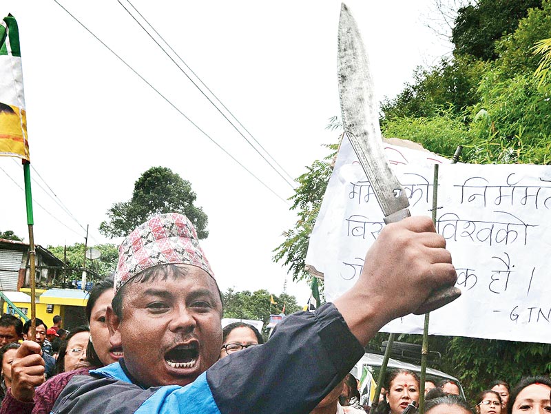 মারমুখী: মিরিকে খুকরি হাতে মোর্চার মিছিল। ছবি: বিশ্বরূপ বসাক।