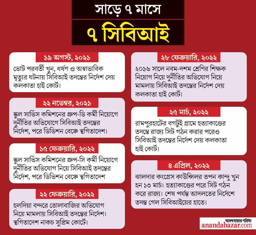 ২০২১ সালের ২ মে রাজ্যে তৃতীয়বার ক্ষমতায় এসেছে মমতা বন্দ্যোপাধ্যায়ের নেতৃত্বাধীন তৃণমূল সরকার। তার পর থেকেই বিরোধীরা রাজ্যে ভোট পরবর্তী খুন, ধর্ষণ, অত্যাচারের অভিযোগ তুলতে শুরু করে। একের পর এক মামলা হয় আদালতে। শেষে ১৯ অগস্ট সিবিআই তদন্তের নির্দেশ দেয় কলকাতা হাই কোর্ট। সেই শুরু। ১৯ অগস্ট থেকে ৪ এপ্রিল। মোটামুটি সাড়ে সাত মাস সময়। এর মধ্যে শুধু শিক্ষাক্ষেত্রে দুর্নীতির অভিযোগেই তিনটি মামলায় সিবিআই তদন্তের নির্দেশ শুনিয়েছে আদালত।