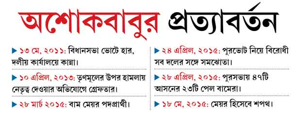 শিলিগুড়ি-মডেলের সাফল্যের পরে স্বাভাবিক ভাবে দলে গুরুত্ব বাড়ছে অশোকবাবুরও। তার ইঙ্গিতও মিলতে শুরু করেছে এ দিন থেকে। শিলিগুড়ির ‘রতনদা’ চেয়েছিলেন, মেয়র ও চেয়ারম্যান পদের নির্বাচনে ঋতব্রত বন্দ্যোপাধ্যায় তাঁদের পাশে থাকুন। অশোকবাবুর সেই ইচ্ছে মেনে নিয়ে টিকিট জোগাড় করে রবিবার রাতে তরুণ সাংসদকে ট্রেনে চাপানোর ব্যবস্থা করে দেন বুদ্ধবাবু-সূর্যবাবুরা। সোমবার মেয়র নির্বাচনের সময় ঋতব্রত ছিলেন অশোকবাবুদের সঙ্গে।