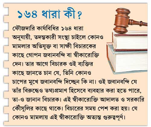 আইনজীবীদের ব্যাখ্যা: তদন্তকারী সংস্থার কাছে দেওয়া সাক্ষ্য (ফৌজদারি দণ্ডবিধির ১৬১ নম্বর ধারায়) বেশির ভাগ ক্ষেত্রে আদালতে গ্রাহ্য হয় না। অভিযুক্তের কৌঁসুলিরা প্রায়ই দাবি করেন, তদন্তকারীদের জবরদস্তির মুখে তাঁদের মক্কেল এমন সাক্ষ্য দিতে বাধ্য হয়েছেন। সে যুক্তি খণ্ডন করা অনেক ক্ষেত্রে কঠিন হয়। কিন্তু বিচারকের কাছে গোপন জবানবন্দি (ফৌজদারি দণ্ডবিধির ১৬৪ নম্বর ধারায়) দিলে ‘জোর খাটানোর’ দাবি তোলার সুযোগ থাকে না। আদালতের কাছেও তা সহজে গ্রাহ্য হয়। আইনজীবী অরুণাভ ঘোষের কথায়, “সাক্ষীরা নিজেরাই বিচারকের কাছে সাক্ষ্যদান (গোপন জবানবন্দি) করলে মনে করা হয়, চাপের মুখে নয়, নিজের ইচ্ছেতেই সাক্ষ্য দিয়েছেন তাঁরা।” এ ধরনের জবানবন্দি তাই প্রামাণ্য নথি হিসেবে গণ্য হয় বলে জানান অরুণাভবাবু।