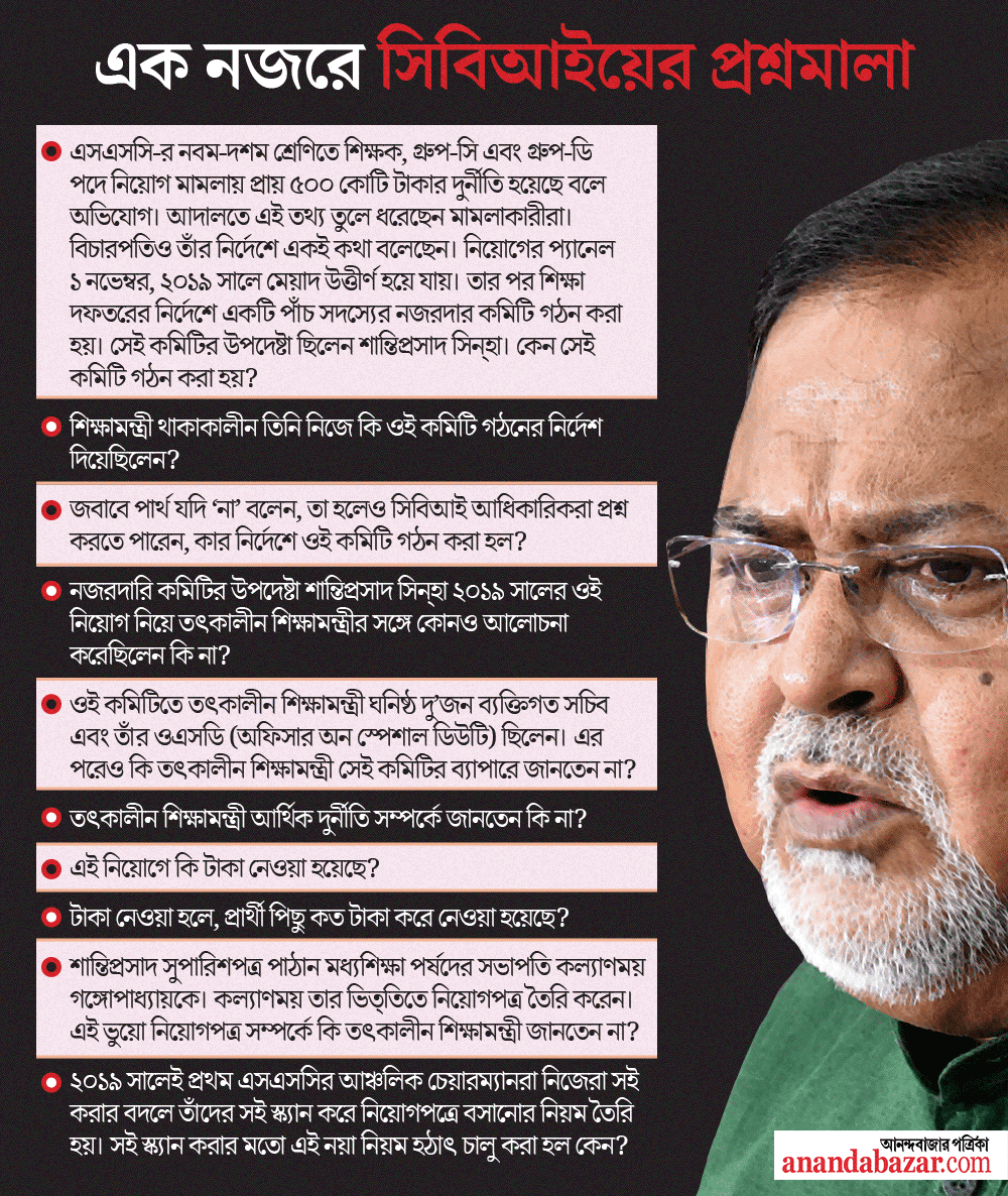 তদন্তকারীদের সূত্রে দাবি, জিজ্ঞাসাবাদের সময় তাঁর জবাবের প্রেক্ষিতে নতুন কিছু প্রশ্নও করা হয় রাজ্যের প্রাক্তন শিক্ষামন্ত্রীকে। শান্তিপ্রসাদ বার বার নিজের বয়ান বদল করেছেন আদালতে। তাঁর মুখোমুখি বসিয়েও ভবিষ্যতে পার্থকে জিজ্ঞাসাবাদ করা হতে পারে বলে খবর সূত্রের।