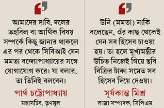 এর পর বিকেলে মমতার পথে নামার কর্মসূচি আনুষ্ঠানিক ভাবে ঘোষণা করে তৃণমূলের মহাসচিব পার্থ চট্টোপাধ্যায় বলেন,‘‘যখনই কোনও নির্বাচন আসে, তখনই কোনও না কোনও অজুহাতে আমাদের বিব্রত করার, খোঁচা দেওয়ার চেষ্টা হয়। সিবিআই-কে কাজে লাগানোর এই পুরনো ছক আমরা জানি। কিন্তু আমাদের প্রশ্ন, দলের এক শীর্ষ পদাধিকারীকে ফোন করার আগে সিবিআই নিয়মমাফিক লিখিত ভাবে নোটিস দিয়ে তারা কী জানতে চায়, জানায়নি কেন? আমাদের দাবি, দলের তহবিল বা আর্থিক বিষয় সম্পর্কে কিছু জানার থাকলে এর পর থেকে সিবিআই যেন তৃণমূল কংগ্রেসের সর্বভারতীয় সভাপতি মমতা বন্দ্যোপাধ্যায়ের সঙ্গে যোগাযোগ করে। যা বলার, তা তিনিই বলবেন।’’