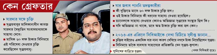 এ দিন গ্রেফতার হওয়া সৃঞ্জয়ের বিরুদ্ধে সারদা কর্তা সুদীপ্ত সেনকে চাপ দিয়ে টাকা আদায় করার অভিযোগ উঠেছে। গত বছর এপ্রিলে কলকাতা ছেড়ে উধাও হওয়ার আগে সুদীপ্ত সিবিআই-কে লেখা চিঠিতে অভিযোগ করেছিলেন, সারদার হাতে থাকা বৈদ্যুতিন চ্যানেলকে সাহায্য করার ব্যাপারে সৃঞ্জয়ের সংবাদপত্রের সঙ্গে তাঁর চুক্তি হয়েছিল। সেই চুক্তি অনুযায়ী প্রতি মাসে ৬০ লক্ষ টাকা করে মোট ২০ কোটি টাকা তিনি সৃঞ্জয়কে দিয়েছিলেন। সুদীপ্তর অভিযোগ ছিল, “আমাকে আশ্বাস দেওয়া হয়েছিল, এই চুক্তির ফলে আমি নির্বিঘ্নে ব্যবসা চালাতে পারব। রাজ্য ও কেন্দ্রীয় সরকারের সঙ্গে ঘনিষ্ঠ সম্পর্ক গড়ে তুলতে পারব। সৃঞ্জয় এ-ও দাবি করেছিলেন যে তিনি মুখ্যমন্ত্রীর বিশেষ ঘনিষ্ঠ।”