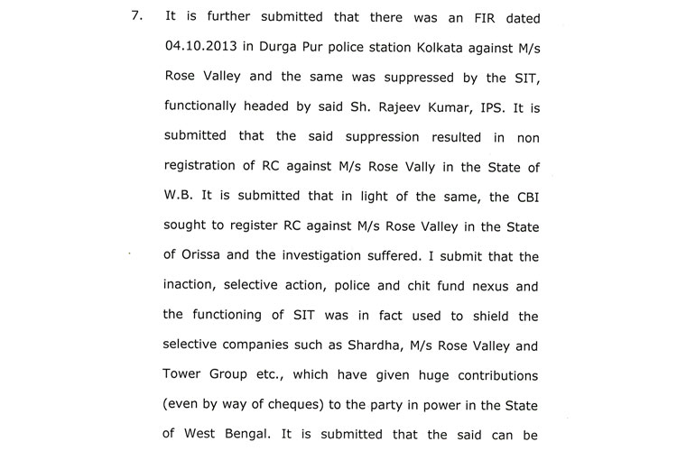 দেশের শীর্ষ আদালতে এদিন জমা পড়া সিবিআইয়ের এই অভিযোগপত্রে সরাসরি তৃণমূলের দিকেও আঙুল তোলা হয়েছে। অভিযোগপত্রে দাবি, সারদা, রোজ ভ্যালি এবং টাওয়ার গ্রুপের মতো কয়েকটি সংস্থাকে আড়াল করতে ‘সিট’ তৈরি করা হয়েছিল এবং এই সব সংস্থা সেই সময়ে রাজ্যে ক্ষমতাসীন রাজনৈতিক দলকে টাকা জুগিয়েছে। তদন্তে রাজ্য পুলিশের বিশেষ তদন্তকারী দলকে কখনও নিষ্ক্রিয় থাকতে, কখনও ‘পছন্দমতো’ তদন্ত করতে দেখা গিয়েছে, এমনকি, অভিযুক্তদের সঙ্গে পুলিশের ‘যোগসাজশের প্রমাণ’ও পাওয়া গিয়েছে বলে কেন্দ্রীয় তদন্তকারী সংস্থার দাবি।