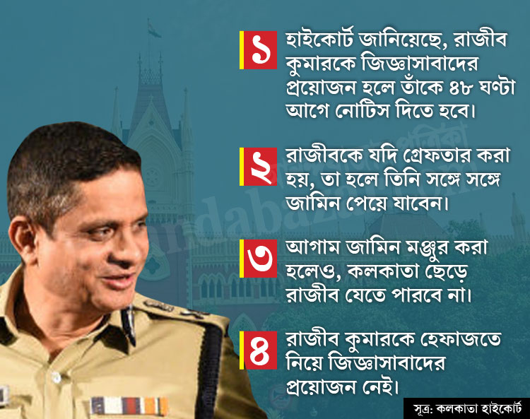 রাজীব কুমারকে হেফাজতে নিয়ে জিজ্ঞাসাবাদের প্রয়োজন নেই বলে মনে করছে ডিভিশন বেঞ্চ। হাইকোর্ট জানিয়েছে, রাজীব কুমারকে জিজ্ঞাসাবাদের প্রয়োজন হলে তাঁকে ৪৮ ঘণ্টা আগে নোটিস দিতে হবে। দু’জন জামিনদার-সহ ৫০ হাজার টাকা বন্ডে আগাম জামিন মঞ্জুর করা হয় রাজীবের। তবে, এই রায়কে চ্যালেঞ্জ জানিয়ে আবেদনের রাস্তা খোলা রয়েছে সিবিআইয়ের কাছে। এ দিন রায় ঘোষণার সময়, জানিয়ে দেওয়া হয় রাজীবকে যদি গ্রেফতার করা হয়, তা হলে তিনি সঙ্গে সঙ্গে জামিন পেয়ে যাবেন। আগাম জামিন মঞ্জুর করা হলেও, কলকাতা ছেড়ে রাজীব যেতে পারবেন না বলেও রায়ে উল্লেখ রয়েছে বলে হাইকোর্ট সূত্রে খবর।