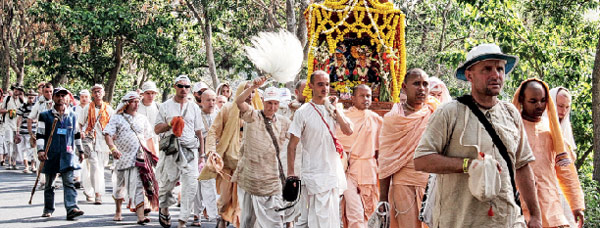 ভিতরের কীর্তনের আসর থেকে সুর ভেসে বেড়াচ্ছে মন্দির চত্বর জুড়ে। সাদা মার্বেল মোড়া বিরাট নাটমন্দিরে একদিকের উঁচু বেদিতে রূপোর সিংহাসনে রাধাকৃষ্ণের যুগলমূর্তি গোলাপে গোলাপে গিয়েছে ঢেকে।