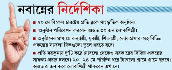 আগামী ২০ মে তৃণমূল সরকারের চতুর্থ বর্ষপূর্তি। নবান্নের নির্দেশ, ওই দিন বিকেল চারটেয় প্রতি ব্লকে সাংস্কৃতিক অনুষ্ঠান করতে হবে। অন্তত ৩০ জন লোকশিল্পীকে এই অনুষ্ঠানে যুক্ত করতে হবে। অনুষ্ঠানের মাধ্যমে কন্যাশ্রী, যুবশ্রী, শিক্ষাশ্রী, লোকপ্রসার প্রভৃতি প্রকল্পের সাফল্যের দিকগুলো তুলে ধরতে হবে। অনুষ্ঠানে গান হবে— ‘নির্মল বাংলা অভিযান/ সবে মিলে রাখব নারী জাতির সম্মান’ অথবা ‘ও খোকার বাপ খোকার জন্য শৌচাগার বানাও না/ভবিষ্যতে ভাবনা রবে না/ রোগ জীবাণুর ভাবনা রবে না’ কিংবা ‘আজ কন্যাশ্রী প্রকল্পে বাজিছে বাজনা/ আজ ঝুমুর পানা তা না নানা না’। অনুষ্ঠানের জন্য ব্লকপিছু ১০ হাজার টাকা করে বরাদ্দ রাখা হয়েছে। আর মহকুমা স্তরে দেওয়া হবে ৭০ হাজার টাকা। শিল্পীদের পারিশ্রমিক অবশ্য তথ্য-সংস্কৃতি দফতর দেবে। অনুষ্ঠান মঞ্চের পিছনের ব্যানারের নকশা নবান্ন থেকে যথা সময়ে পাঠিয়ে দেওয়া হবে বলেও জানানো হয়েছে নির্দেশিকায়।