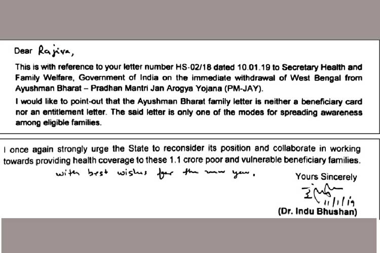 এর পরেই ইন্দু ভূষণ লিখেছেন, ‘ইতিমধ্যেই ১৭৫ কোটি টাকা দেওয়া হয়েছে। স্বাস্থ্যসাথী প্রকল্পে রাজ্যের ৫০ লক্ষ বা ২৫% পরিবার সুবিধা পাচ্ছিল। আয়ুষ্মান ভারত আসার পরে ১.১ কোটি বা ৫৫% পরিবার ৫ লাখ টাকার বিমার সুবিধা পাবে। এই প্রকল্প থেকে বেরিয়ে গিয়ে রাজ্য কি গরিব মানুষকে বিমার সুবিধা থেকে বঞ্চিত করতে চায়?’ রাজ্য কিন্তু এখনই এ নিয়ে এগোতে নারাজ। স্বাস্থ্য ভবনের এক কর্তা বলেন, ‘‘ইতিমধ্যেই ৪০ লাখ পরিবারে মোদীর ছবি সম্বলিত চিঠি চলে গিয়েছে। ভোটের আগে ঘরে ঘরে মোদীর চিঠি পাঠিয়ে রাজনীতি করছে বিজেপি।’’