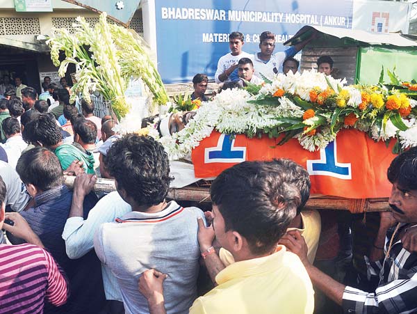 অন্তিম: মনোজের মৃতদেহ নিয়ে ভদ্রেশ্বরের পথে দলীয় কর্মীরা। বুধবার। ছবি: তাপস ঘোষ