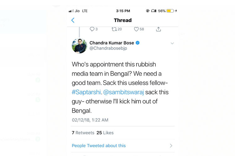 শনিবার রাতে সম্বিত পাত্রকে একটি টুইট করেন চন্দ্র। সেখানে রাজ্য বিজেপির মিডিয়া সেলের ইনচার্জ সপ্তর্ষি চৌধুরীর নামে যা-তা কথা বলেন। টুইটে তিনি লেখেন, “পশ্চিমবঙ্গের বিজেপি মিডিয়া সেল একটা অপদার্থ। এদের নিয়োগ করেছে কে? এদের বরখাস্ত করুন।” ওই টুইটে সম্বিত পাত্রকে চন্দ্র আরও বলেন, “সপ্তর্ষিকে তাড়িয়ে দিন। না তাড়ালে আমিই ওঁকে রাজ্য থেকে লাথি মেরে বার করে দেব।” এ ধরনের বেফাঁস মন্তব্যের পরই চরম বিতর্কের মুখে পড়েছেন এই বিজেপি নেতা।