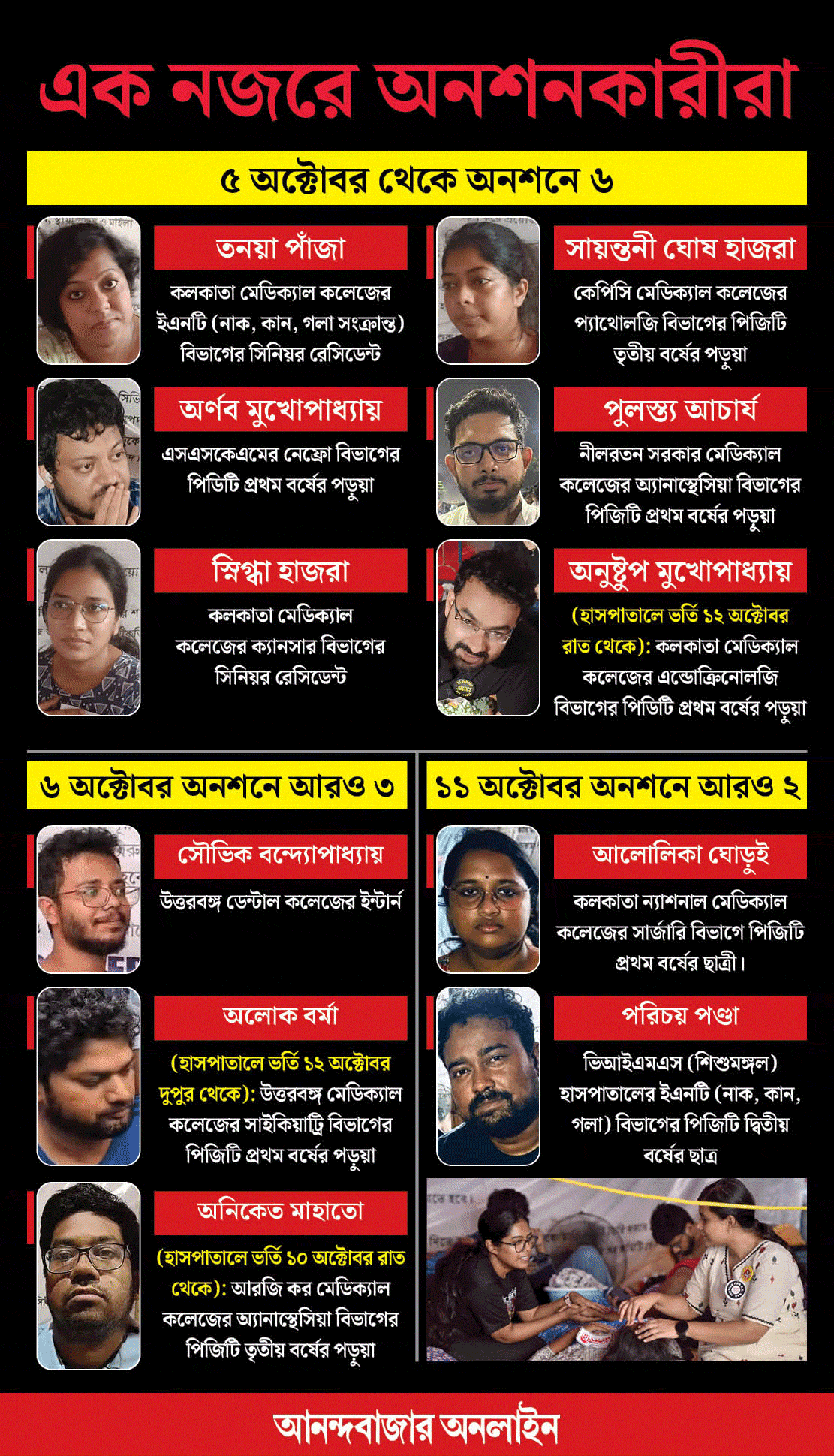 ১০ দফা দাবি নিয়ে গত ৫ অক্টোবর থেকে ধর্মতলায় আমরণ অনশন করছেন কয়েক জন জুনিয়র ডাক্তার। শুধু কলকাতায় নয়, উত্তরবঙ্গ মেডিক্যাল কলেজেও দুই জুনিয়র ডাক্তার অনশন শুরু করেন। রবিবার জুনিয়র ডাক্তারদের অনশন নবম দিনে পড়ল। সকল অনশনকারীর শারীরিক অবস্থারই অবনতি ঘটছে। শরীরে দেখা দিচ্ছে নানা জটিলতা। ইতিমধ্যেই তিন জন জুনিয়র ডাক্তারকে হাসপাতালে ভর্তি করানো হয়েছে। আইসিইউতে রেখে চিকিৎসা চলছে। অনশনকারীদের স্বাস্থ্য নিয়ে উদ্বিগ্ন সকলেই। জুনিয়র ডাক্তারদের আন্দোলনে যোগ দিয়েছেন সাধারণ মানুষ। প্রথম থেকে জুনিয়রদের পাশে থেকেছেন সিনিয়র চিকিৎসকদের একটা বড় অংশ।