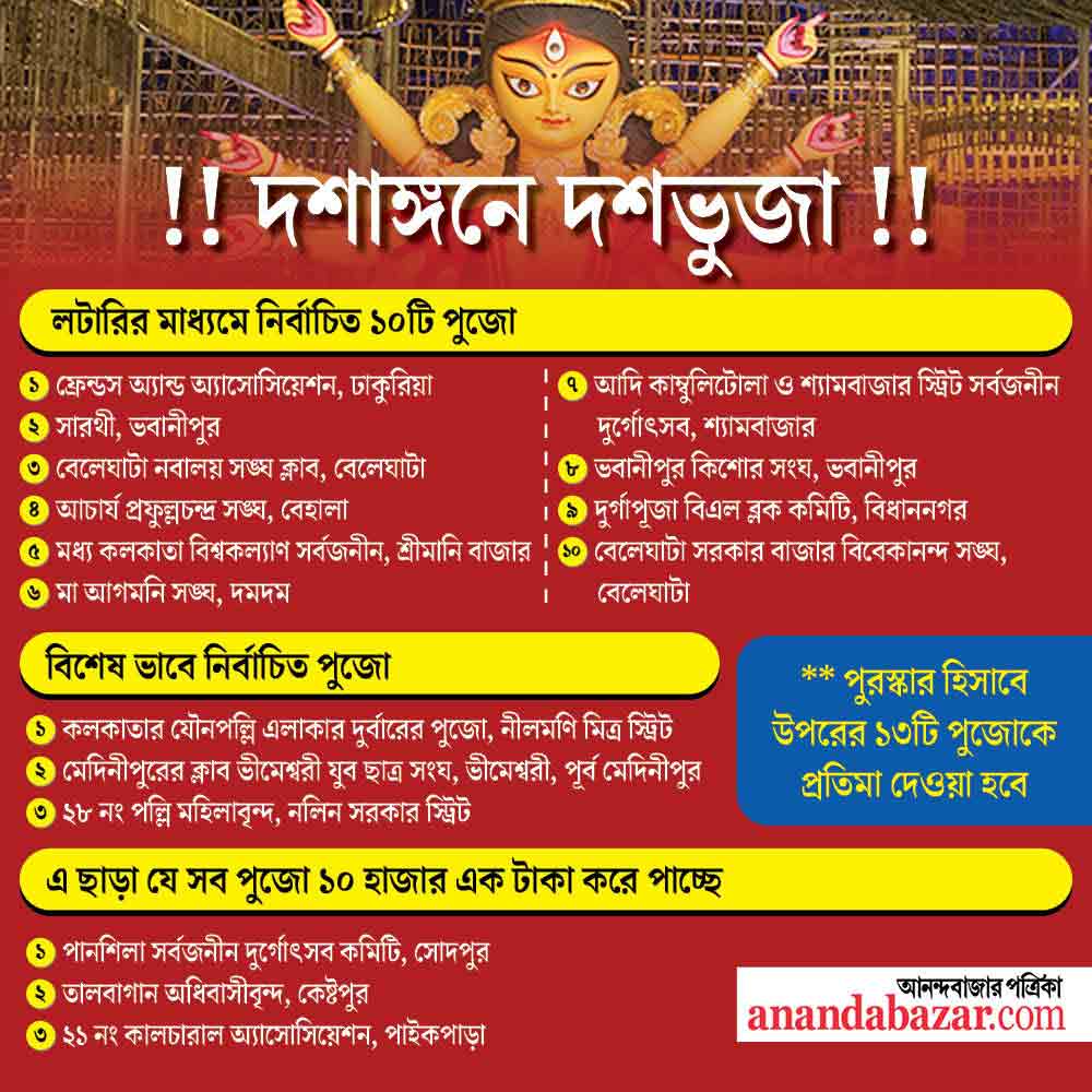 পুজোর আগেই পুজোর পুরস্কার! শুনতে আজব মনে হলেও শারদোৎসবের আগেই ১৬টি পুজো কমিটিকে পুরস্কৃত করেছে কলকাতারই এক নামজাদা পুজো কমিটি। করোনা সংক্রমণের কারণে গত বছর থেকেই হিন্দু বাঙালির মহাপার্বণেও আর্থিক মন্দার আঁচ পড়েছে। তাই পুজোর বহু আগেই উত্তর কলকাতার চোরবাগান সর্বজনীন দুর্গোৎসব সমিতি ঘোষণা করেছিল, এবারের শারোদৎসবে ১০টি পুজো কমিটিকে প্রতিমা বানিয়ে দেওয়া হবে। প্রায় ১০০-রও বেশি আবেদন জমা পড়েছিল পুজো উদ্যোক্তাদের কাছে। বাছাই করতে লটারির সাহায্য নিয়ে শনিবার ১০টি পুজো কমিটির নাম ঘোষণা করেছেন তাঁরা। পুজো প্রাঙ্গণেই বিশিষ্ট ব্যক্তিদের উপস্থিতিতে মৃৎশিল্পীরা লটারির মাধ্যমে ১০টি ক্লাব কমিটিকে বেছে নেন। এই অনুষ্ঠানে হাজির ছিলেন রাসবিহারীর বিধায়ক দেবাশিস কুমার, জোড়াসাঁকোর প্রাক্তন বিধায়ক স্মিতা বক্সী, সমাজসেবী কার্তিক বন্দ্যোপাধ্যায় ও সৌম্য বক্সী।