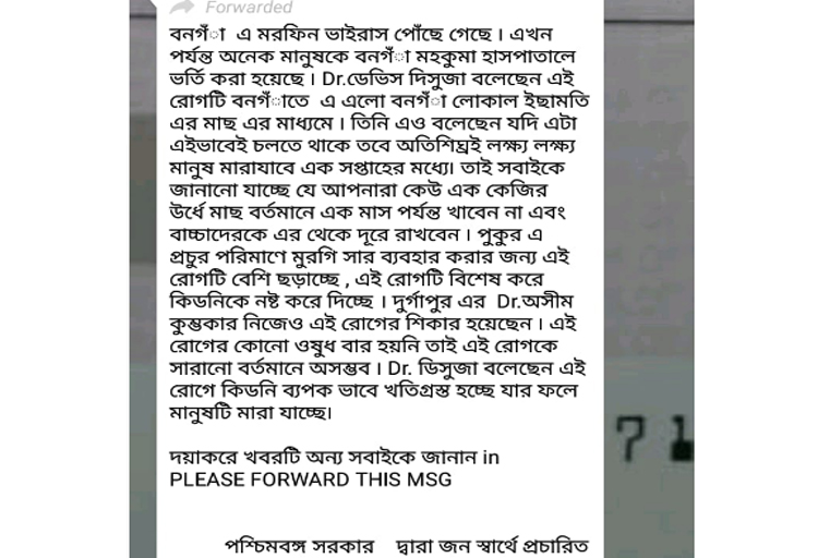 সিআইডি সূত্রে খবর, ‘বনগাঁ লোকাল’ নামে একটি হোয়াটসঅ্যাপ গ্রুপ থেকেই মরফিন ভাইরাসের ভুয়ো মেসেজ পাঠানো হয়। সেই হোয়াটস্অ্যাপে ডেভিস ডিসুজা নামে কোনও এক চিকিৎসক বনগাঁর মানুষদের সতর্ক করছেন এই ভাইরাস থেকে। তিনি বলছেন, ইছামতি নদীর মাছ, যেগুলো ১ কেজি ওজনের বেশি, সেগুলোতেই এই ভাইরাস রয়েছে। মাছের থেকে শরীরে প্রবেশ করে এই প্রাণঘাতী মরফিন ভাইরাস। তার পর কিডনি পুরোপুরি অকেজো করে তোলে। এর কোনও ওষুধ নেই। শরীরে প্রবেশের এক সপ্তাহের মধ্যেই মানুষের মৃত্যু হবে। পুকুরে প্রচুর পরিমাণে মুরগি সার ব্যবহারের জন্যও এই ভাইরাসে আক্রান্ত হতে পারে মাছ।
