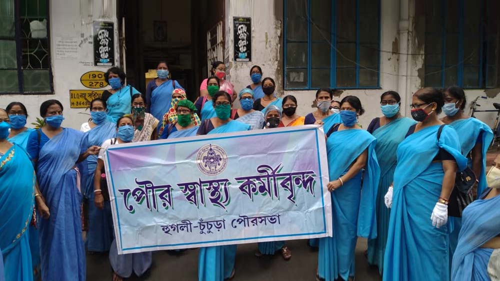 করোনা-ভাতার দাবি জানাচ্ছেন চুঁচুড়ার পুর-স্বাস্থ্যকর্মীরা। নিজস্ব চিত্র।