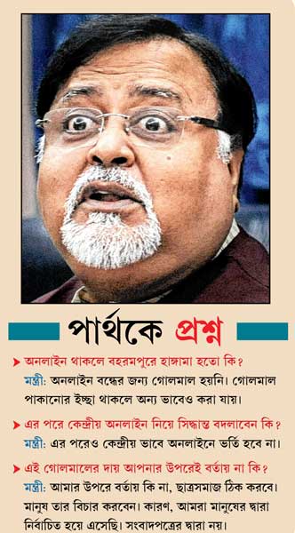 অথচ কলকাতার একাধিক কলেজের অধ্যক্ষদের মতো বহরমপুর কলেজের অধ্যক্ষ সমরেশ মণ্ডলও মনে করেন, “কেন্দ্রীয় অনলাইনে ভর্তির ব্যবস্থা থাকলে এই গোলমাল এড়ানো যেত।” শিক্ষামন্ত্রী অবশ্য তা মনে করেন না। তাঁর মন্তব্য, “অনলাইন বন্ধের জন্য গোলমাল হয়নি। গোলমাল পাকানোর ইচ্ছা থাকলে অন্য ভাবেও করা যায়।” তাঁর কাছে জানতে চাওয়া হয়, বহরমপুরের ঘটনার দায় তাঁর উপরে বর্তাবে না কেন? মন্ত্রীর জবাব, “গোলমালের দায় আমার উপরে বর্তায় কি না, ছাত্রসমাজ ঠিক করবে। মানুষ তার বিচার করবেন। কারণ, আমরা মানুষের দ্বারা নির্বাচিত হয়ে এসেছি। সংবাদপত্রের দ্বারা নয়।”