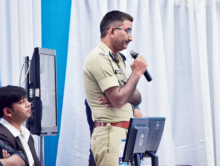 কাঠগড়ায়: প্রশাসনিক বৈঠকে মুখ্যমন্ত্রীর প্রশ্নবাণের মুখে জেলার পুলিশ সুপার শীষরাম ঝাঝারিয়া। ছবি: সুদীপ ভট্টাচার্য