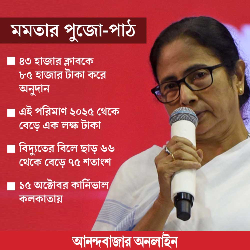 মঙ্গলবার রাজ্যের পুজো কমিটিগুলির সঙ্গে বৈঠকে বসেন মুখ্যমন্ত্রী। বিধানসভায় মন্ত্রিসভার বৈঠক শেষে তিনি চলে যান নেতাজি ইন্ডোর স্টেডিয়ামে। সেখানেই রাজ্য প্রশাসনের শীর্ষকর্তা, কলকাতা পুলিশের আধিকারিক এবং ‘ফোরাম ফর দুর্গোৎসব’ সংগঠনের প্রতিনিধিদের সঙ্গে আগামী শারদোৎসব নিয়ে বৈঠক করেন। ভিডিয়ো কনফারেন্সে যোগ দেন জেলা পুজো কমিটিগুলির প্রতিনিধিরাও। সেখানেই মমতা ঘোষণা করেন, চলতি বছর ৪৩ হাজার ক্লাবকে দুর্গাপুজোর জন্য ৮৫ হাজার টাকা করে অনুদান দেওয়া হবে। এর মধ্যে ৪০ হাজার পুজো রয়েছে জেলাগুলিতে। ২০২৫ সাল থেকে এই অনুদান বৃদ্ধি পেয়ে হবে এক লক্ষ টাকা। গত বছরও ক্লাবগুলির জন্য অনুদান বৃদ্ধি করা হয়েছিল। সে বার ৭০ হাজার টাকা করে অনুদান দেওয়া হয়েছিল ক্লাবগুলিকে। ২০২২ সালে প্রতিটি ক্লাব পেয়েছিল ৬০ হাজার টাকা করে। পুজো কমিটিগুলিকে বিদ্যুতের মাসুলেও ৭৫ শতাংশ ছাড় দেওয়ার জন্য সিইএসই এবং রাজ্য বিদ্যুৎ বণ্টন পর্ষদকে বলেছেন মুখ্যমন্ত্রী। গত বছর বিদ্যুতের মাসুলে ৬৬ শতাংশ ছাড় দেওয়ার অনুরোধ জানিয়েছিলেন মমতা। তার আগের বছর ৬০ শতাংশ ছাড় দেওয়া হয়েছিল।