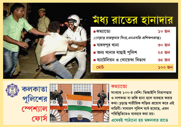 পুলিশকর্তাদের একাংশ বলছেন, সিপি এবং হাতেগোনা কয়েক জন শীর্ষকর্তার নির্দেশ ছাড়া কম্যান্ডোর মতো বিশেষ বাহিনীকে নিয়োগ করা যায় না। বারবার ফোন পাওয়ার পরে এক সময় যাদবপুরে থাকা পুলিশকর্তারা কন্ট্রোল রুম মারফত জানতে পারেন, পুলিশ ট্রেনিং স্কুল থেকে দশ জন কম্যান্ডো আসছেন। রাত একটার পরে কম্যান্ডোরা এসে পৌঁছন যাদবপুরে। রাত আড়াইটে নাগাদ হঠাৎই অরবিন্দ ভবনের সামনে আলো নিভে যায়। তার পরেই শুরু হয় ‘অপারেশন’।