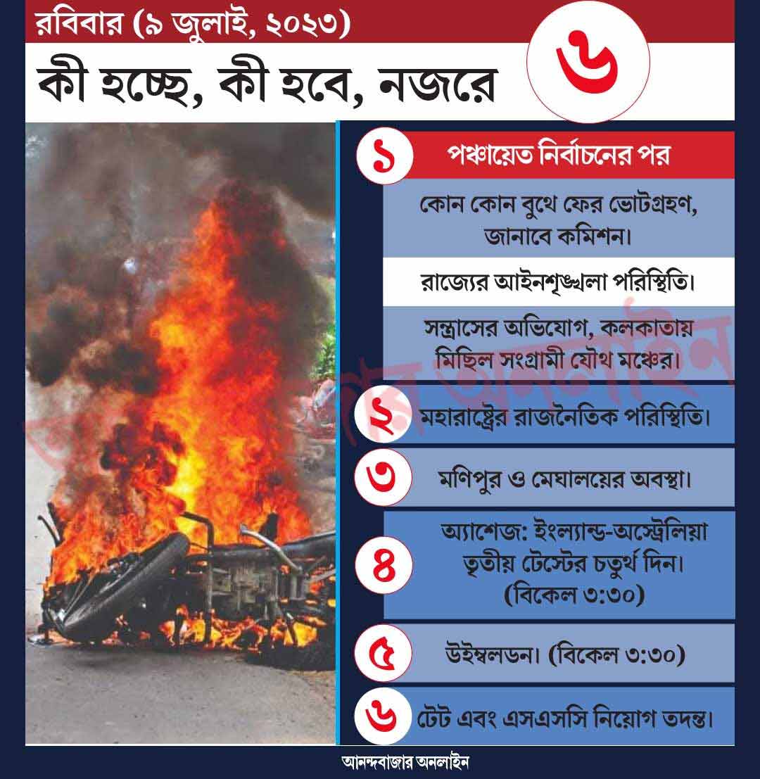 শনিবার রাজ্যের পঞ্চায়েতের ভোটগ্রহণ হয়েছে। আজ, রবিবার স্ক্রুটিনি রয়েছে। কোন কোন বুথে ফের ভোটগ্রহণ করা হবে তা জানাবে রাজ্য নির্বাচন কমিশন। অন্য দিকে, ভোটের দিন প্রায় ১৪ জনের মৃত্যু হয়। এই অবস্থায় রাজ্যের আইনশৃঙ্খলা পরিস্থিতির দিকে নজর থাকবে। এ ছাড়া সন্ত্রাসের অভিযোগে আজ কলকাতায় মিছিল রয়েছে সংগ্রামী যৌথ মঞ্চের। বিকেল ৪টে নাগাদ এই কর্মসূচিটি রয়েছে।