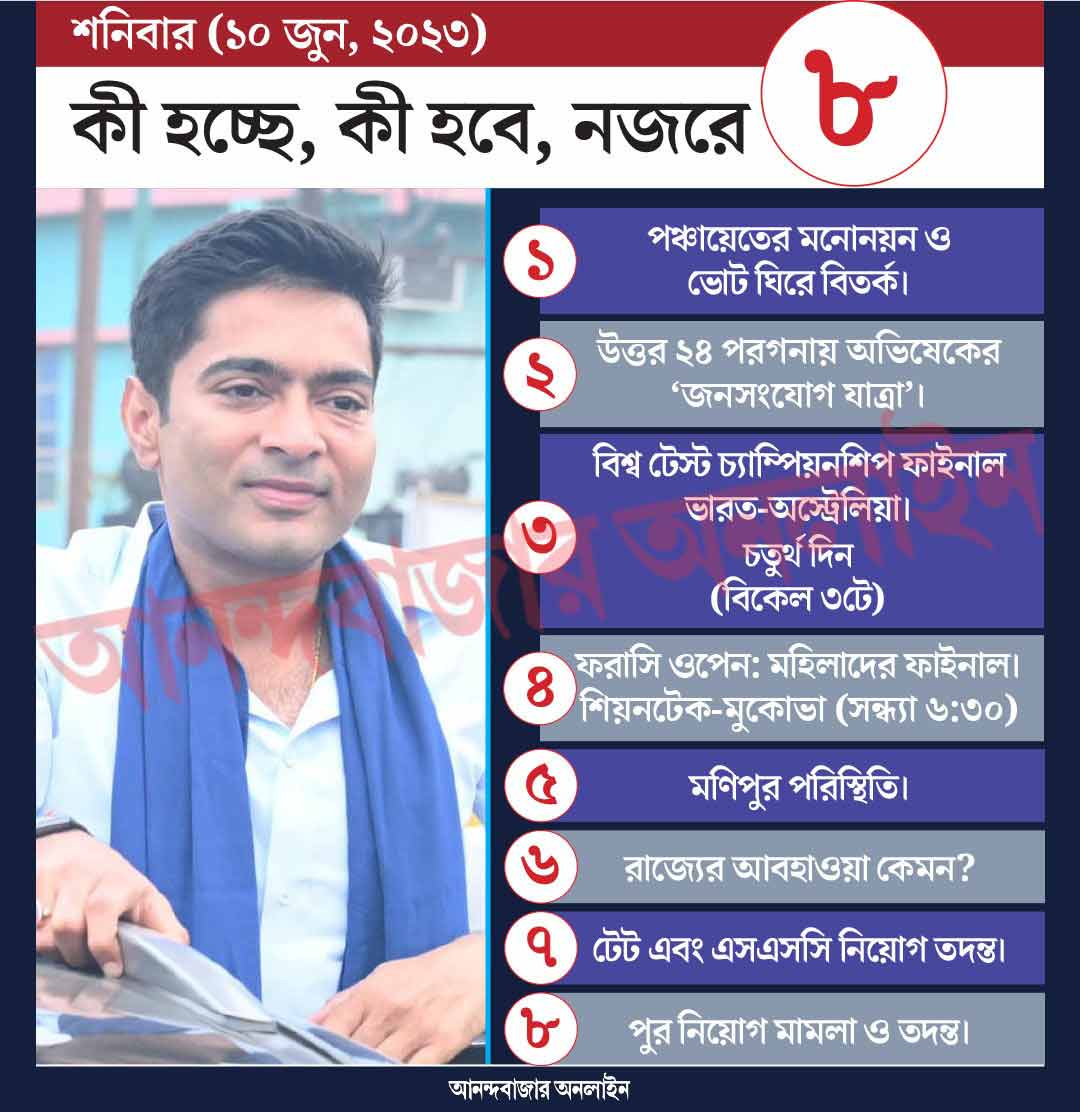 শুক্রবার থেকে শুরু হয়েছে পঞ্চায়েত নির্বাচনের মনোনয়ন জমা দেওয়ার কাজ। চলবে আগামী ১৫ জুন পর্যন্ত। মনোনয়ন পেশের জন্য মাত্র ৫ দিন সময় দেওয়ায় সরব হয়েছে বিরোধীরা। কলকাতা হাই কোর্টও বিষয়টি নিয়ে পর্যবেক্ষণ রেখেছে। অন্য দিকে, প্রার্থীদের মনোনয়নকে ঘিরে কিছু জায়গা থেকে অশান্তির খবর আসছে। পঞ্চায়েত নির্বাচন ঘিরে শুরু হয়েছে নানা বিতর্ক। আজ, শনিবার এই সংক্রান্ত নানা খবরের দিকে নজর থাকবে।