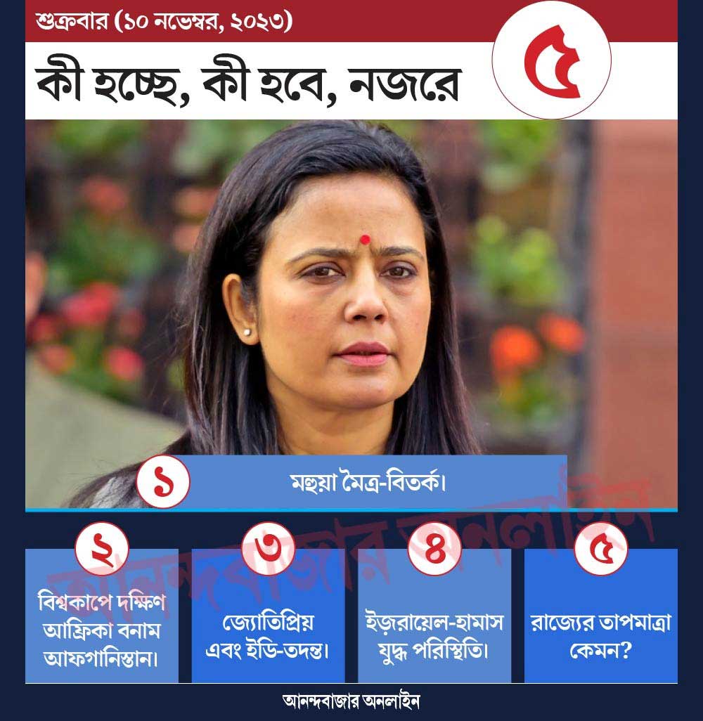 তৃণমূল সাংসদ মহুয়া মৈত্রকে সাংসদ পদ থেকে বহিষ্কারের সুপারিশ করেছে লোকসভার এথিক্স কমিটি। সংখ্যা গরিষ্ঠের মতের ভিত্তিতে ওই কমিটি সুপারিশে অনুমোদন দেয়। শুক্রবার সেই রিপোর্ট পাঠানো হবে লোকসভার স্পিকার ওম বিড়লার কাছে। স্পিকার এই প্রস্তাব পেশ করবেন সংসদের আগামী অধিবেশনে। বিরোধীরা আলোচনা চাইলে তা আদৌ স্পিকার গ্রহণ করবেন কি না সেটি তাঁর এক্তিয়ারের বিষয়। এই সংক্রান্ত খবরে নজর থাকবে আজ।
